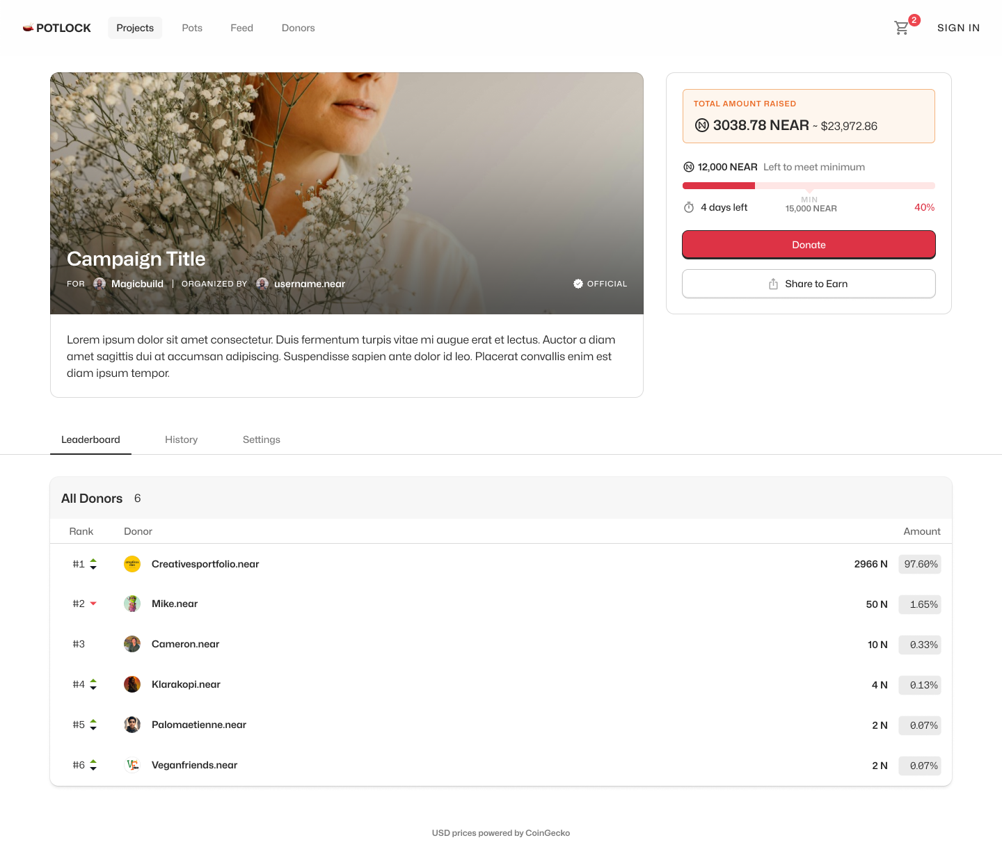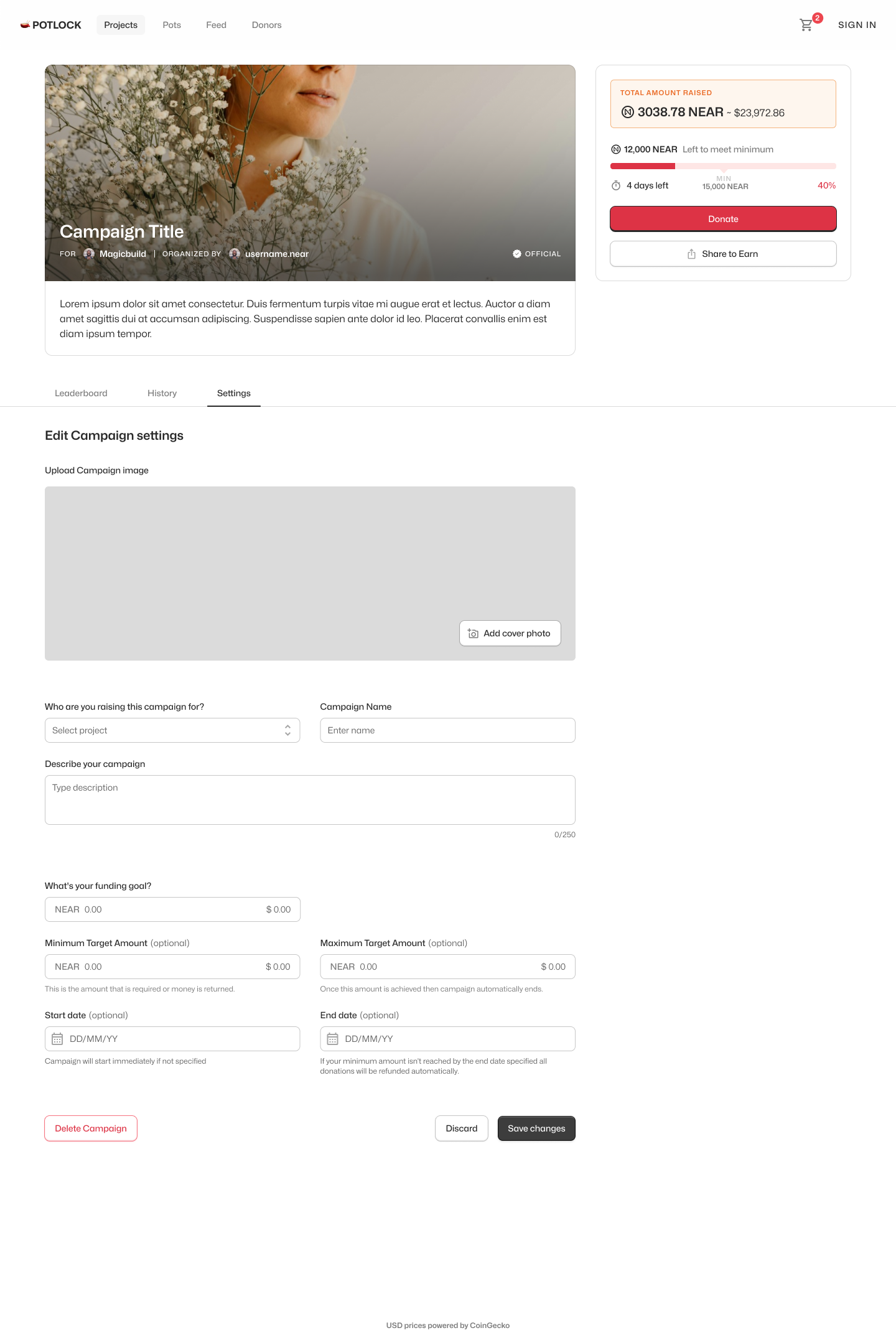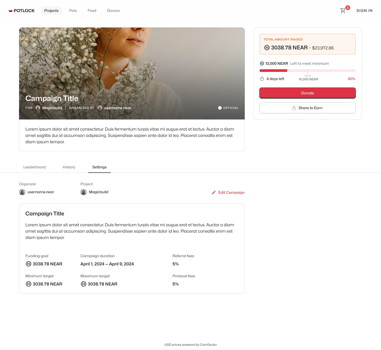In the settings you are able to view funding goals, camapgin durations, referrals and protocol fees. Admins / owners can edit campaigns