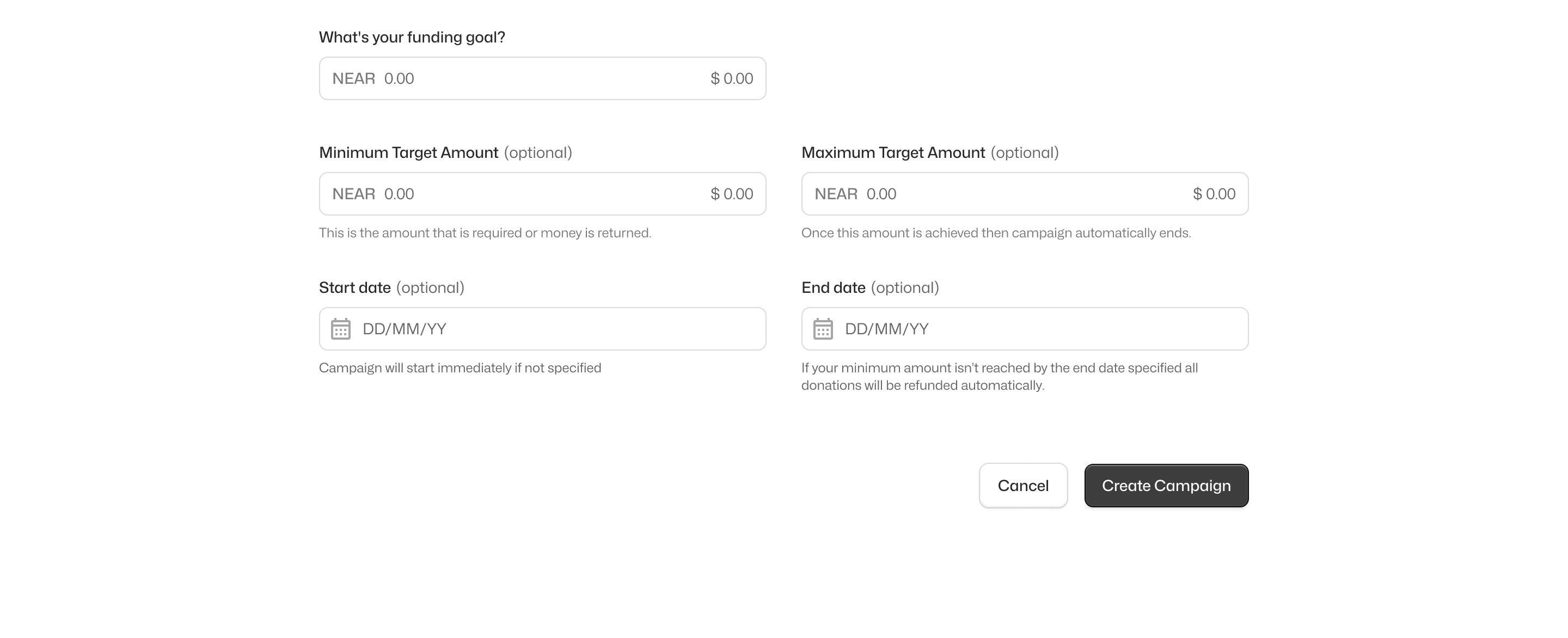 - Enter NEAR Wallet Address: Input the NEAR wallet address of the project or individual for whom the campaign is being created. This is crucial as it ensures that funds raised through the campaign are directed to the correct beneficiary.